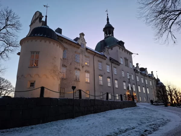 Vi intar en smakfull lunch på Hotel Hernhe innan vi åker vidare t mot Kobergs slott som är belägget utan för Trollhättan, vi anländer vid julmarknadens öppning. Slottet har en historia som sträcker sig tillbaks till 1400-talet och fick sitt nuvarande utseende under 1800-talets slut då en omfattande renovering genomfördes.